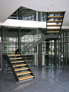 Die Treppe im Innern der Ellipse erschließt Geschäfts- und Wohnräume. Das Treppenhaus zeigt seinen technischen und konstruktiven Anspruch deutlich.