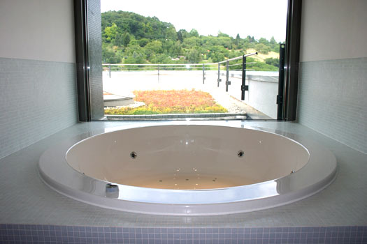 Der runde Whirlpool ist nur über ein Glaselement von der Dachterrasse des Dachgeschosses getrennt und bietet eine - uneinsehrbare - Aussicht.