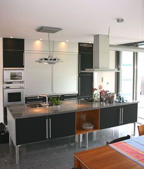 Moderne Küche mit freistehender Kochinsel aus Alu, Edelstahl, Granit und Linoleum.