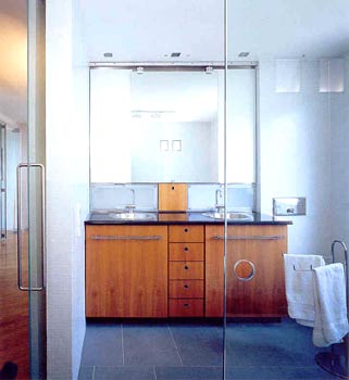 Die Kombination von toskanischem Sandstein, weißem Glasmosaik, Edelstahl, Kischbaumholz und einer durchdachten Beleuchtung erzeugen eine helle großzügige Atmosphäre.