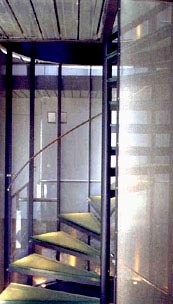 In einem Lochblechzylinder erschließt eine Stahlwendeltreppe mit Glasstufen die Geschosse.