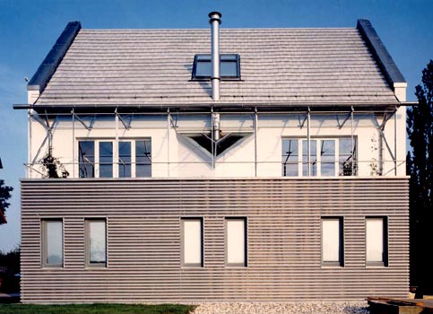 Die Materialwahl und die Farbgestaltung der jeweiligen Fassaden verdeutlichen diesen Entwurfsgedanken - der Flachdachriegel mit silbergrauer Zedernholzbekleidung und grau lackierten Holzfenstern - das Giebelhaus mit weißer Putzfassade und weiß lackierten Holzfenstern. |
