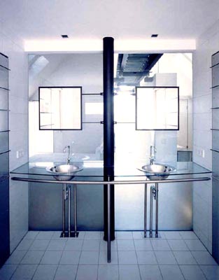 Die gläserne Rückwand des Badezimmers ermöglicht den Blick in den Galeriebereich.