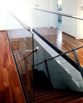 Der Eindruck des Durchtauchens der einläufigen Treppe wird verstärkt durch die Ganzglasgeländer im Obergeschoss.