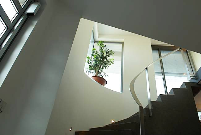 Das 60er Jahre Haus in einem gewachsenen Baugebiet wurde umgebaut und um einen zweigeschossigen Wintergarten erweitert. Das alte Treppenhaus wurde erhalten und völlig überarbeitet - die alte geschwungene Treppe wurde zur Skulptur. |